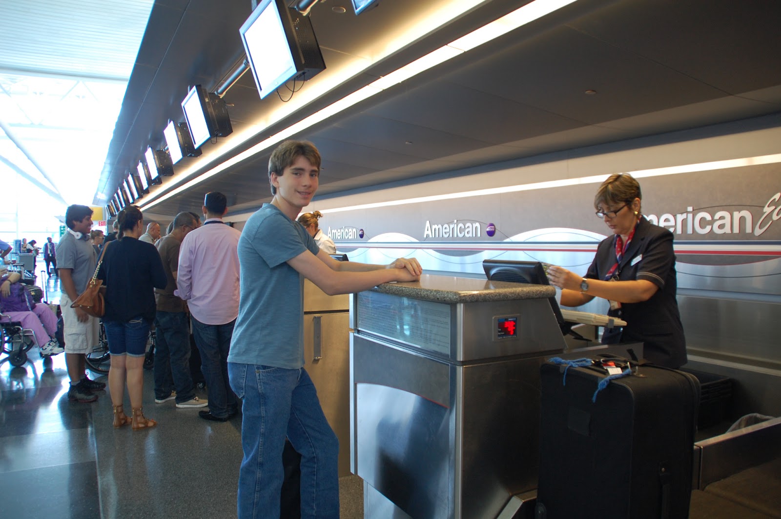 He's checking in here. The suitcase I packed for him was 31 pounds which was well under the 44 lb weight limit. He'll have some room for souvenirs on the return trip.
